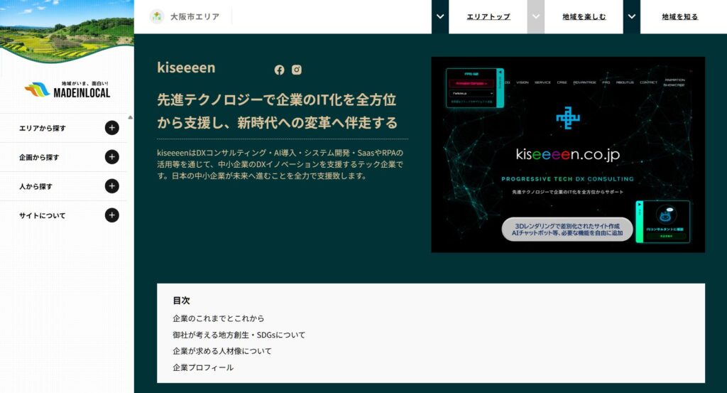 このたび、地方創生メディア「Made In Local」が運営する「大阪市を代表する企業100選」に、株式会社kiseeeenが選出されました。