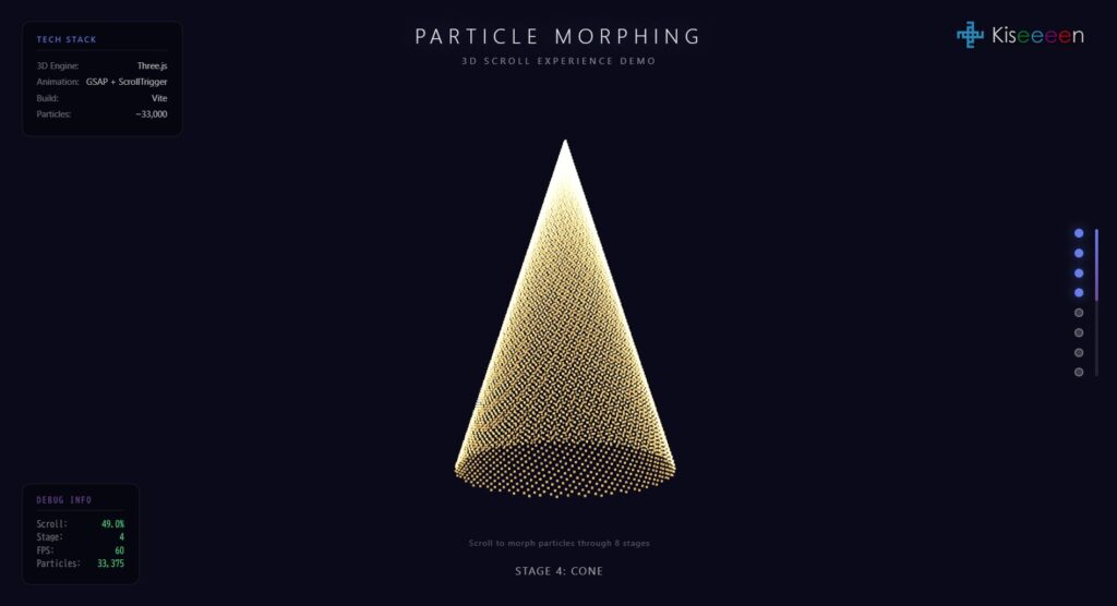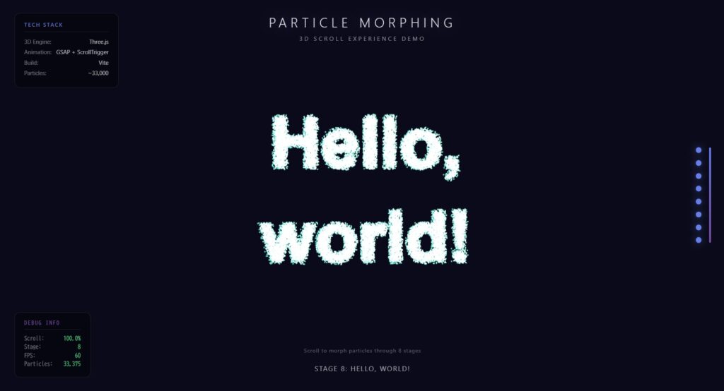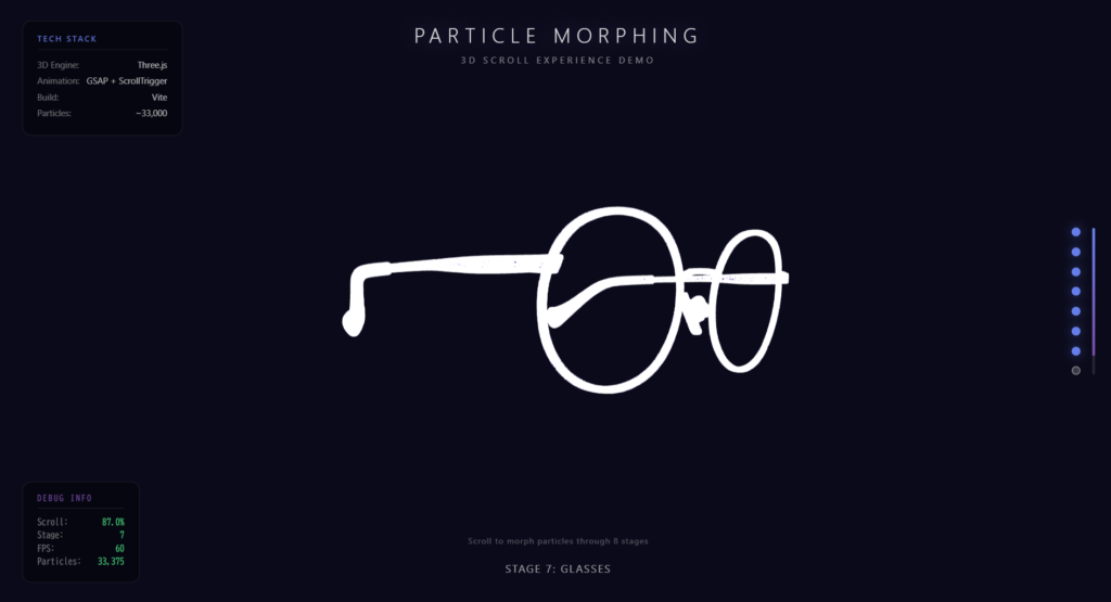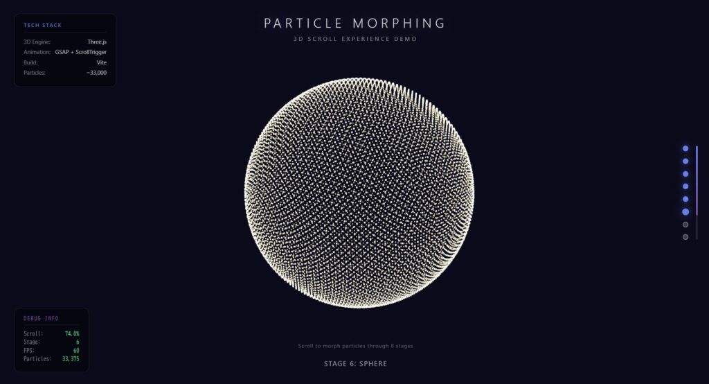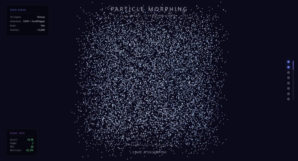 このデモでは、約33,000個のパーティクル(粒子) がスクロールに連動して8つの形状に変化していきます。Three.js(3Dエンジン)とGSAP(アニメーションライブラリ)を組み合わせ、没入感のある3D体験を実現しています。